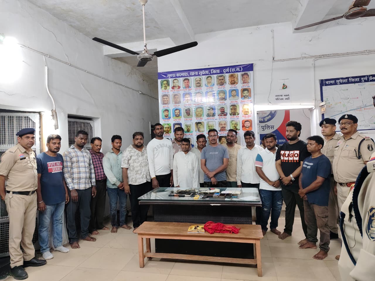 - आरोपी :1. विक्की साहनी, उम्र 34 वर्ष, निवासी मल्हा पारा सुपेला2. विनय, उम्र 36 वर्ष, निवासी सेक्टर 07 भिलाई3. हिमांचल दास, उम्र 56 वर्ष, निवासी आदर्श नगर दुर्ग4. शैलेन्द्र यादव, उम्र 30 वर्ष, निवासी गया नगर दुर्ग5. हेमलाल ढीमर, उम्र 26 वर्ष, निवासी रूआबांधा भिलाई6. सतीश गुर्दे, उम्र 48 वर्ष, निवासी कोसा नगर सुपेला7. विज्जू जैन, उम्र 50 वर्ष, निवासी अहिवारा8. किशन साहू, उम्र 46 वर्ष, निवासी बजरंग नगर रायपुर9. सोनू कुमार साव, उम्र 21 वर्ष, निवासी राम नगर सुपेला10. जशवंत साहू, उम्र 26 वर्ष, निवासी खोरपा अभनपुर11. लक्की साहू, उम्र 28 वर्ष, निवासी बेदरी थाना राखी12. जुलेश लाल, उम्र 44 वर्ष, निवासी शंकर नगर दुर्ग13. हीरा सिंह, उम्र 30 वर्ष, निवासी सुपेला14. मोह. अरशद अंसारी, उम्र 27 वर्ष, निवासी कैम्प 02 छावनी15. दिनेश साव, उम्र 41 वर्ष, निवासी कांट्रेक्टर कॉलोनी सुपेला।