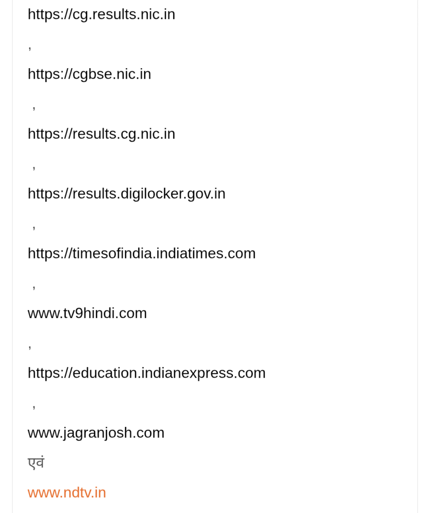 रायपुर # सीजी। छत्तीसगढ़ माध्यमिक शिक्षा मण्डल, रायपुर द्वारा आयोजित हाईस्कूल एवं हायर सेकण्डरी मुख्य परीक्षा वर्ष 2026 के परीक्षा परिणाम 29 अप्रैल को दोपहर 2.30 बजे जारी किए जाएंगे। मण्डल द्वारा परीक्षार्थियों की सुविधा के लिए विभिन्न अधिकृत वेबसाइटों के माध्यम से ऑनलाइन परीक्षा परिणाम देखने की व्यवस्था सुनिश्चित की गई है। माध्यमिक शिक्षा मंडल के अधिकारियों ने बताया कि परीक्षार्थी अपना अनुक्रमांक (Roll Number) दर्ज कर निम्न वेबसाइटों पर अपना परीक्षा परिणाम देख सकते हैं।