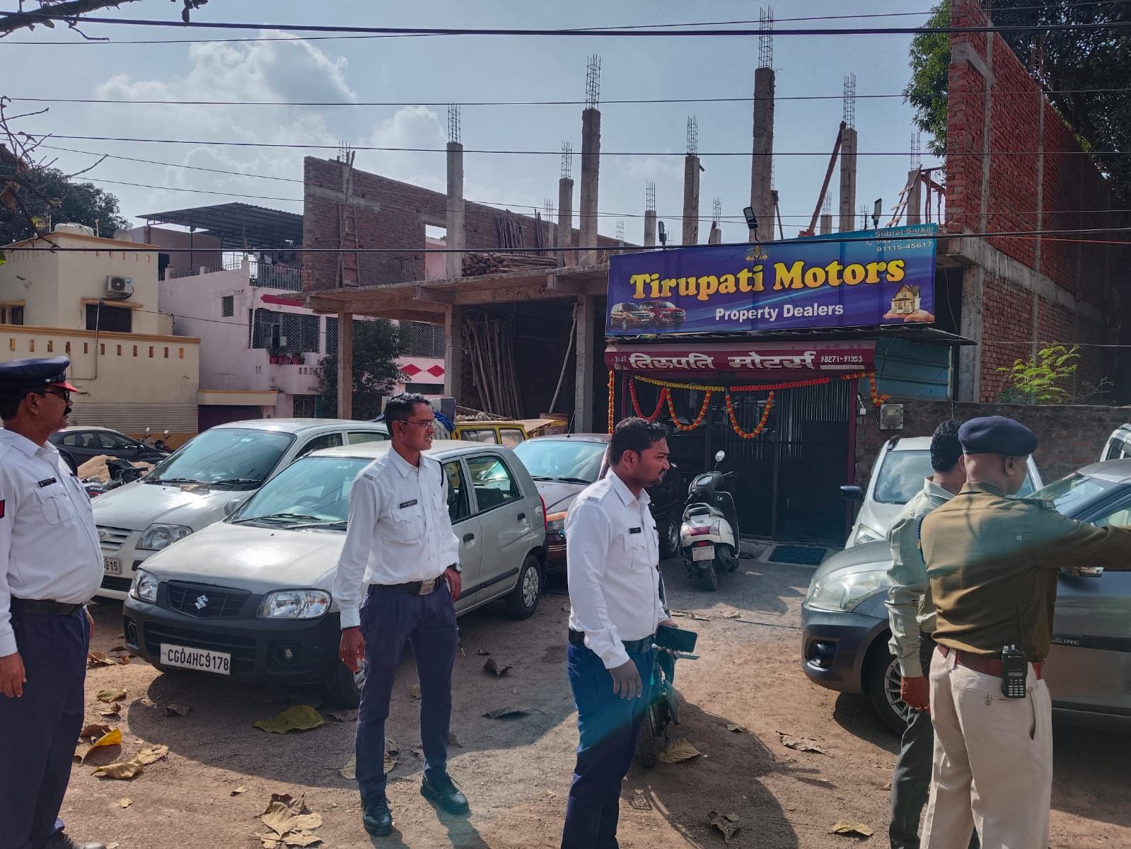 दुर्ग। महाराजा चौक से जेल तिराहा तक नो पार्किग में खड़ी वाहनों पर ऑनलाइन चालानी कार्रवाई की गई। साथ ही ऑटो डील संचालकों को सड़क पर वाहन खड़ा ना करने समझाइश दी गई। शॉपिंग काम्प्लेक्स, होटल संचालकों को बाहर गार्ड तैनात करने, सड़क पर वाहन पार्क ना करने कहा गया।