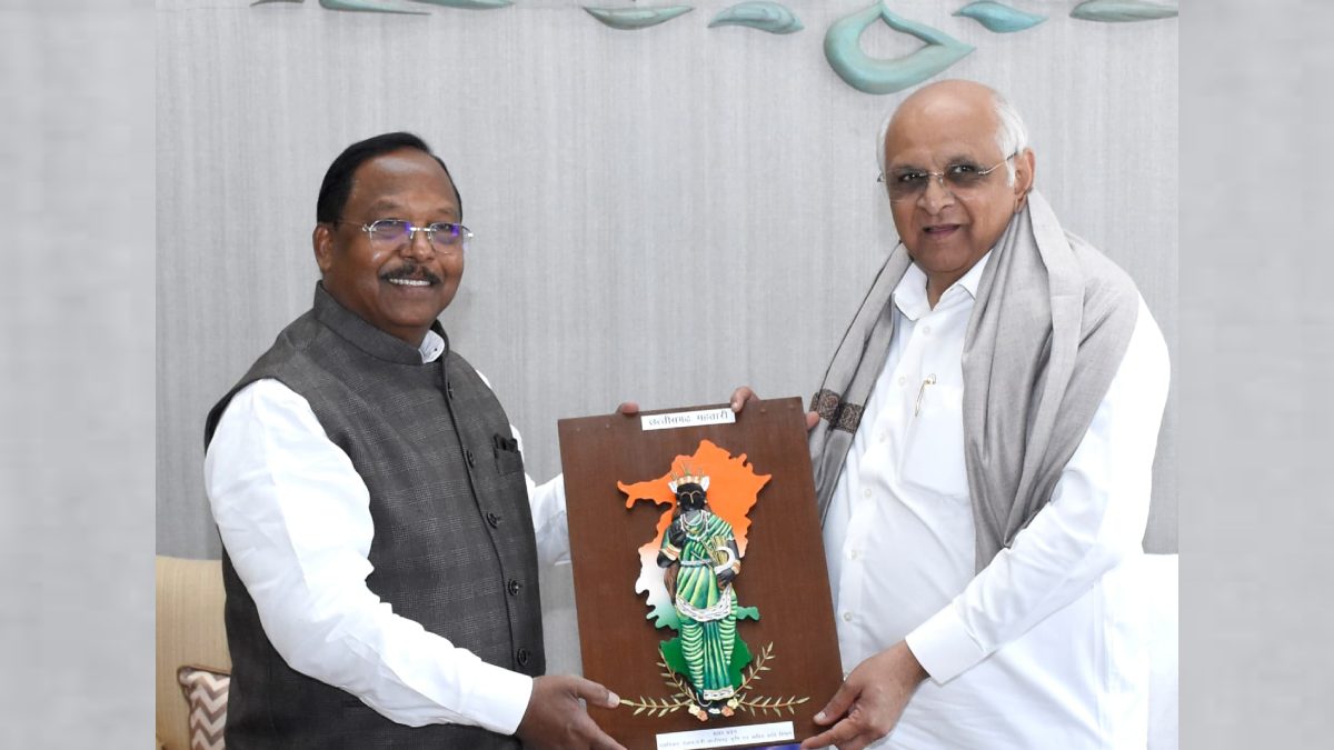 रायपुर । छत्तीसगढ़ के आदिम जाति विकास और किसान कल्याण मंत्री रामविचार नेताम ने आज गुजरात राज्य के प्रवास के दौरान मुख्यमंत्री भूपेंद्रभाई पटेल से मुलाकात की। मंत्री नेताम ने इस मौके पर मुख्यमंत्री को छत्तीसगढ़ महतारी की प्रतिमा भेंट की।