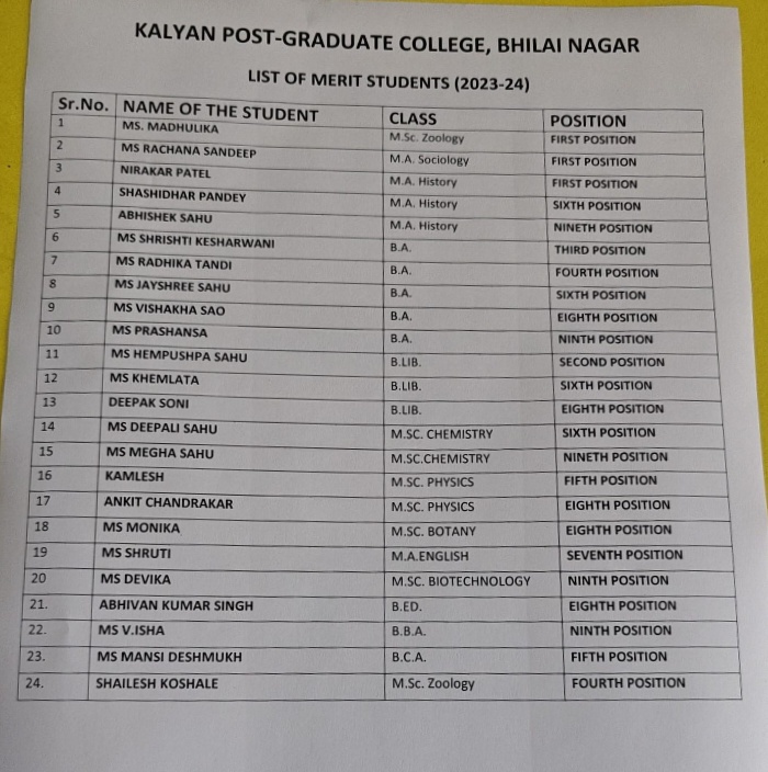 भिलाई के सबसे प्रतिष्ठित शिक्षण संस्थानों में से एक कल्याण स्नातकोत्तर महाविद्यालय के 24 स्टूडेंट्स ने विश्वविद्यालय की मेरिट सूची में स्थान बनाया। शासकीय हेमचंद यादव विश्वविद्यालय द्वारा स्नातक और स्नातकोत्तर स्तर के कई पाठयक्रम के परीक्षा परिणामों को घोषित किया गया। इसमें कई नामचीन महाविद्यालयों को पछाड़ते हुए कल्याण कॉलेज के 24 स्टूडेंट्स यूनिवर्सिटी की टॉप-टेन लिस्ट में शामिल हुए। -कॉलेज के कहा हमारी उपलब्धि हैं आप यूनिवर्सिटी की मेरिट लिस्ट में शामिल हुए सभी 24 विद्यार्थियों को सम्मानित किया गया। बाकायदा कॉलेज प्रबंधन द्वारा एक सम्मान कार्यक्रम आयोजित कर भविष्य के नेतृत्वकर्ताओं को सम्मानित किया गया। सम्मान स्वरूप हरेक टॉपर को बुके भेंट किया गया। मुंह मीठा कराया गया। साथ ही कहा गया कि आप लोगों का कल्याण कॉलेज में होना महाविद्यालय के लिए एक बड़ी उपलब्धि है। सभी टॉपर्स विद्यार्थियों को कॉलेज में प्रेरित किया गया। बाकायदा प्राचार्य, उप प्राचार्य, सभी संकाय प्रभारी और अनेक विभागों के मुखिया, अध्यक्षों, सहायक प्राध्यापकों ने स्नातक के होनहारों को स्नातकोत्तर के लिए प्रेरित किया।