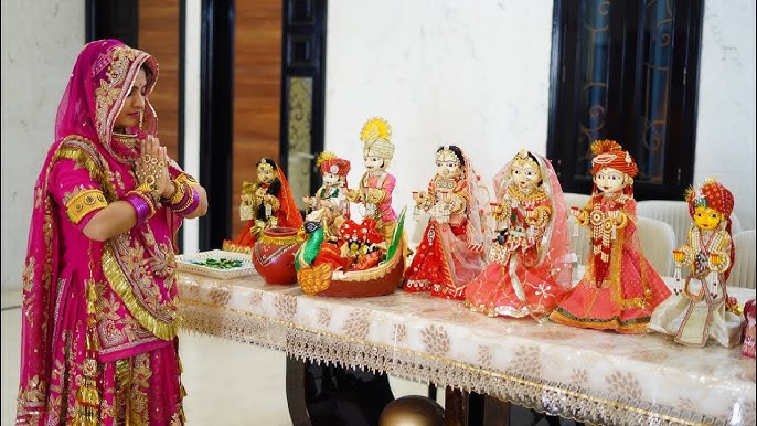 आसन पर इसर जी और गौरा जी को श्रृंगार कर बिठाएं।