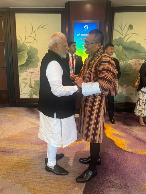 एक्स पोस्ट| प्रधानमंत्री नरेन्द्र मोदी ने आज थाईलैंड के बैंकॉक में छठे बिम्सटेक शिखर सम्मेलन से अलग भूटान के प्रधानमंत्री शेरिंग तोबगे से मुलाकात की।