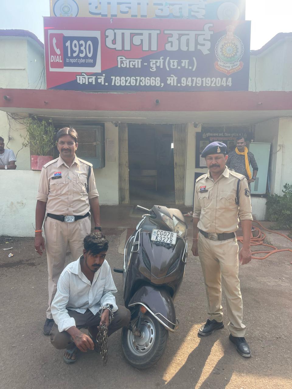 पुलिस ने बताया कि 16 अप्रैल को प्रार्थी हेमराज जैन साईं कालोनी उतई ने थाना स्कूटी चोरी की रिपोर्ट दर्ज कराई थी। प्रार्थी ने रिपोर्ट में बताया कि 12 अप्रैल को 11.30 बजे एक्टीवा सीजी 07 बीके 3278 को अमृत ट्रेडर्स किराना दुकान के पास उतई में खड़ा किया था जो दोपहर करीब 03.30 बजे वहां से गायब मिला। आसपास पातासाजी के बाद स्कूटी चोरी को रिपोर्ट दर्ज कराई थी।
