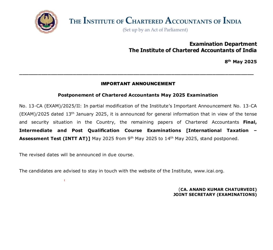 9 मई से 14 मई के बीच आयोजित चार्टर्ड अकाउंटेंट्स फाइनल, इंटरमीडिएट और पोस्ट क्वॉलिफिकेशन कोर्स परीक्षाएं अब नहीं होंगे.