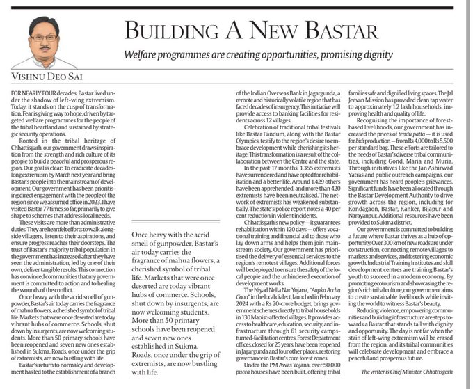 “बस्तर की उग्रवाद से एकीकरण तक की यात्रा जन-केंद्रित शासन की शक्ति को दर्शाती है। मुख्यमंत्री @vishnudsai ने बताया कि कैसे आदिवासी कल्याण, सुरक्षा और विकास छत्तीसगढ़ के लिए एक नया अध्याय लिख रहे हैं। इसे अवश्य पढ़ें!”