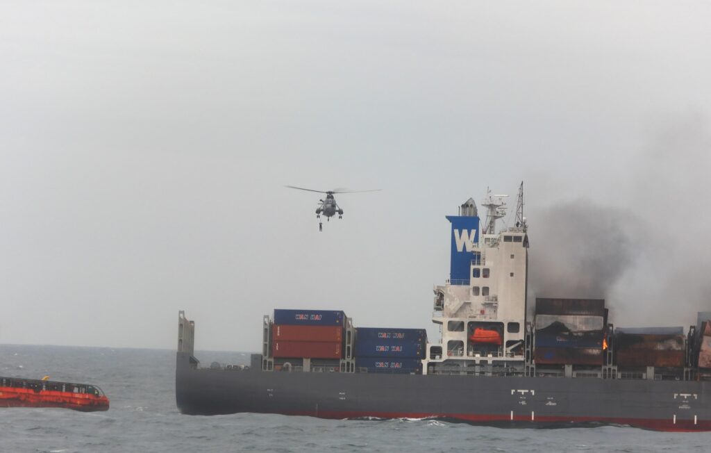 कोच्चि के आईएनएस गरुड़ में एक सीकिंग हेलीकॉप्टर पर चढ़ाया गया था। नौसेना के हेलीकॉप्टर ने चुनौतीपूर्ण मौसम, समुद्री परिस्थितियों और जहाज पर लगी आग के बीच टीम को सफलतापूर्वक पोत पर उतारा।