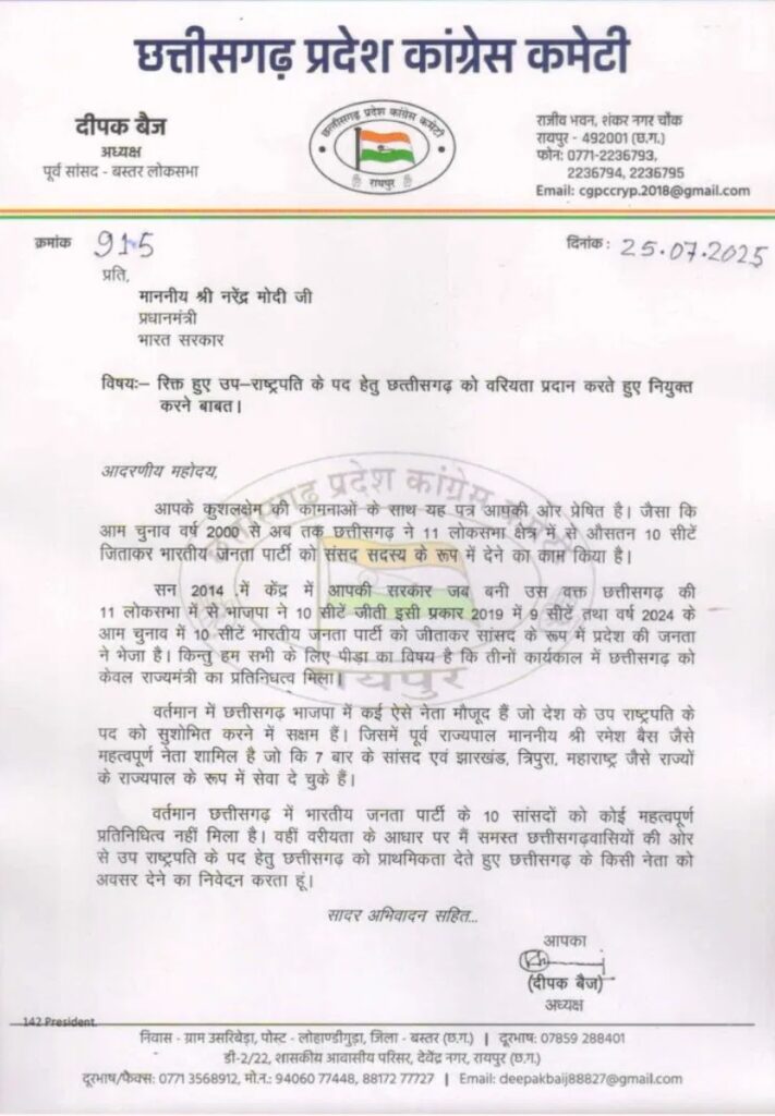 रायपुर- प्रदेश कांग्रेस अध्यक्ष दीपक बैज ने प्रधानमंत्री नरेंद्र मोदी को पत्र लिखा है। पत्र में उन्होंने छत्तीसगढ़ के बीजेपी नेता और पूर्व राज्यपाल रमेश बैस को उपराष्ट्रपति बनाने की मांग की है।