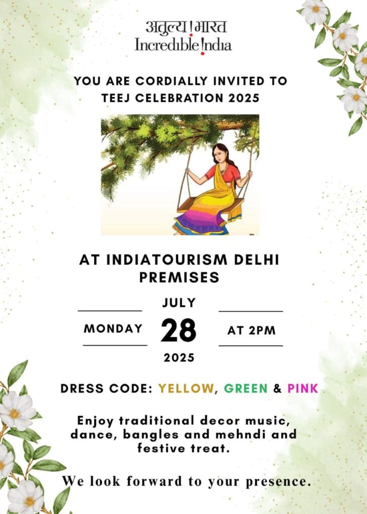 New Delhi| पर्यटन मंत्रालय के तहत इंडियाटूरिज्म दिल्ली 28 जुलाई 2025 को जीवंत और सांस्कृतिक रूप से समृद्ध तीज महोत्सव के भव्य आयोजन की घोषणा की है। यह कार्यक्रम 88 जनपथ, नई दिल्ली स्थित इंडियाटूरिज्म कार्यालय में आयोजित किया जाएगा, जिसमें भारतीय विरासत के रंगों, परंपराओं और भावना को प्रदर्शित किया जाएगा।