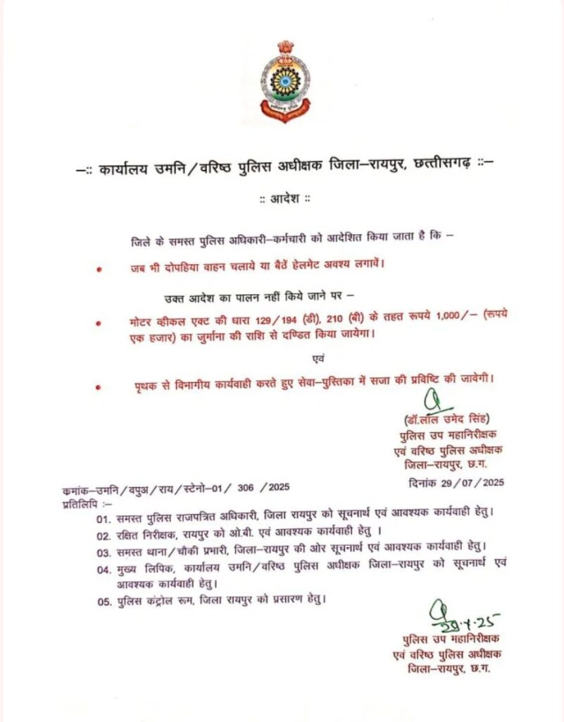 रायपुर- रायपुर जिले के पुलिस अधिकारियों और कर्मचारियों के लिए हेलमेट लगाना हुआ अनिवार्य. अब दोपहिया वाहन चलाते व बैठते समय हेलमेट नहीं लगाने पर होगी कडी कर्रवाई.एसएसपी