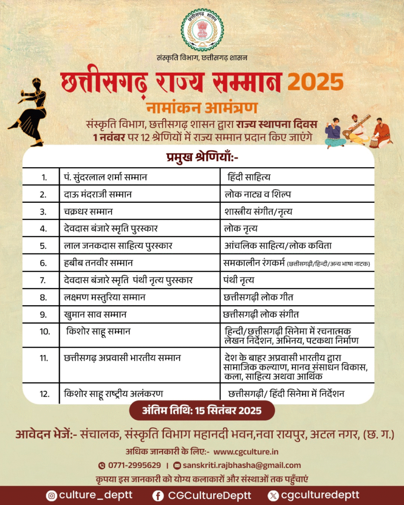 Raipur| संस्कृति विभाग, छत्तीसगढ़ शासन द्वारा राज्य स्थापना दिवस 2025 के अवसर पर कला, साहित्य, संगीत, रंगमंच एवं अन्य सांस्कृतिक क्षेत्रों में विशिष्ट योगदान देने वाली प्रतिभाओं हेतु ‘छत्तीसगढ़ राज्य सम्मान 2025’ हेतु नामांकन आमंत्रित किए जा रहे हैं। इच्छुक अभ्यर्थी अपना नामांकन दिनांक 15 सितम्बर 2025 तक निम्न पते पर भेज सकते हैं: संचालक, संस्कृति विभाग द्वितीय तल, व्यावसायिक परिसर, सेक्टर-27,महानदी भवन, अटल नगर, नया रायपुर (छ.ग.) – 492002