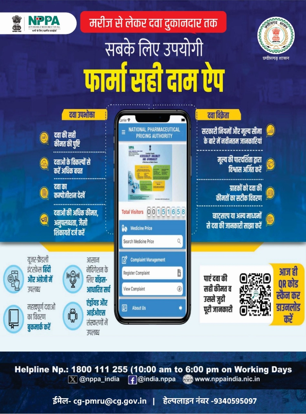 रायपुर, राष्ट्रीय औषधि मूल्य निर्धारण प्राधिकरण ने दवा कीमतों में पारदर्शिता लाने और उपभोक्ताओं को सशक्त बनाने के उद्देश्य से एक मोबाइल ऐप लॉन्च किया है।”फार्मा सही दाम” मोबाइल ऐप दवा कीमतों में पारदर्शिता और उपभोक्ता सशक्तिकरण की दिशा में उठाया गया एक नया कदम है। यह ऐप मरीजों, आम जनता और दवा विक्रेताओं सभी के लिए उपयोगी है।
