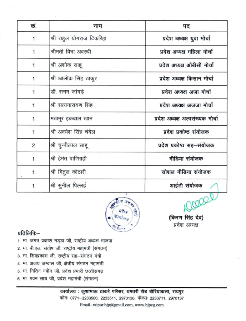 रायपुर khabardb24। छत्तीसगढ़ भाजपा की बहुप्रतीक्षित कार्यकारिणी बुधवार को जारी कर दी गई है। प्रदेश अध्यक्ष किरण सिंह देव की नई टीम में आठ उपाध्यक्ष बनाए गए हैं। यशवंत जैन, अखिलेश सोनी और नवीन मारकंडे तीन महामंत्री बनाए गए हैं। युवा मोर्चा के अध्यक्ष पद की जिम्मेदारी राहुल योगराज टिकरिहा को सौंपा गया है। वहीं महिला मोर्चा की जिम्मेदारी विभा अवस्थी को दी गई है। आलोक सिंह ठाकुर किसान मोर्चा के प्रदेश अध्यक्ष बनाए गए हैं। हेमंत पाणिग्रही को मीडिया संयोजक बनाया गया है। राम गर्ग को कोषाध्यक्ष का पद सौंपा गया है। देवलाल ठाकुर, नितिन ठोकने, अमित चिमनानी समेत 12 प्रवक्ता बनाए गए हैं।