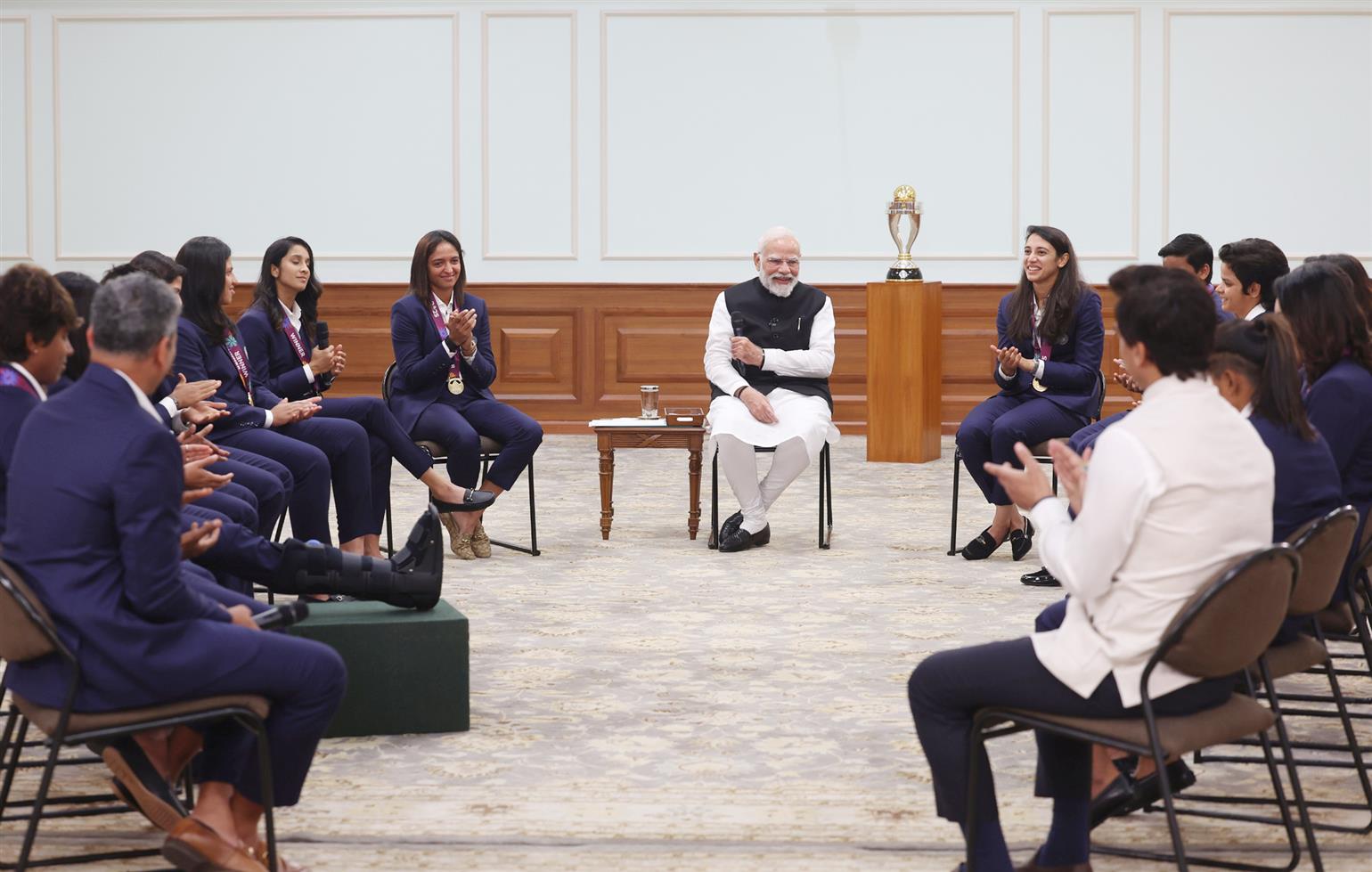 कप्तान हरमनप्रीत कौर ने 2017 में प्रधानमंत्री से मुलाकात को याद किया जब ट्रॉफी नहीं मिली थी और वर्षों से जिस ट्रॉफी के लिए उन्होंने मेहनत की थी, उसे अब मिलने पर अत्यधिक सम्मान महसूस किया। उन्होंने कहा कि प्रधानमंत्री ने उनकी खुशी दोगुनी कर दी और यह उनके लिए बहुत गर्व की बात है। उन्होंने यह भी कहा कि उनका लक्ष्य भविष्य में भी उनसे मिलते रहना और उनके साथ टीम की तस्वीरें खिंचवाना है।
